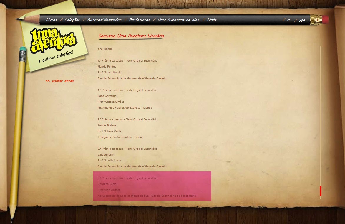 A nossa aluna, Carolina Serra, do 10º J, ficou em 3º lugar, categoria texto original, no concurso Uma Aventura Literária 2021, promovido pela Editorial Caminho, num universo superior a 11 mil participantes de todo o país e também das escolas que lecionam português no estrangeiro.